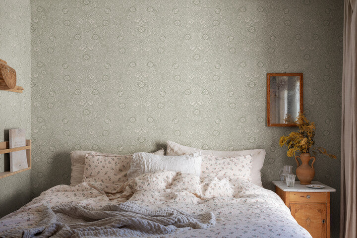 Caroline is a rich winding botanical background with a pleasant appearance. A pattern that amazes with its small fine details that appear and grow the closer you look.