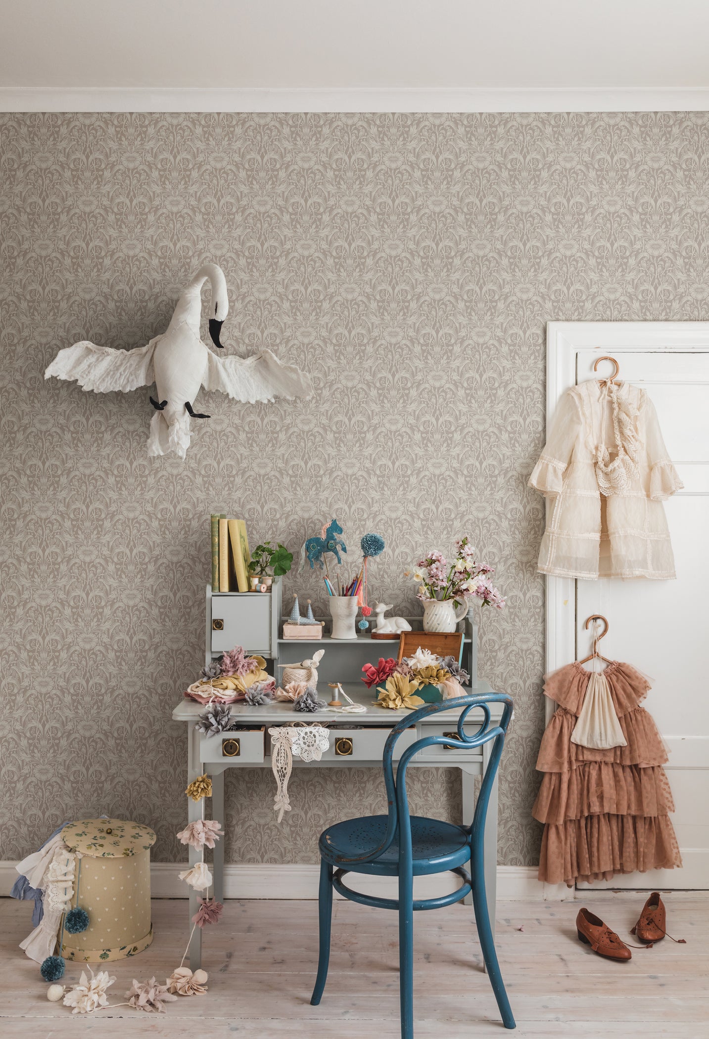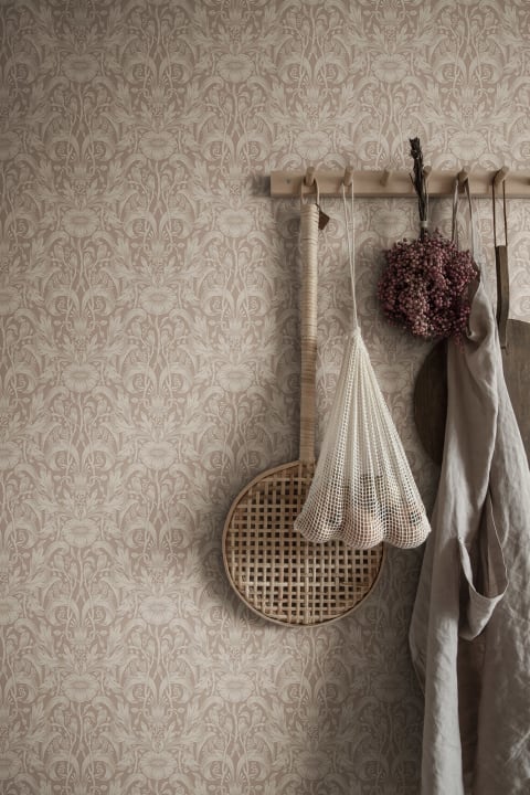 Like the fields of late summer. Our interpretation of a classic medallion is woven into an intricate background of leaves and arched straws. The dense pattern is rich in detail and creates a sense of serene movement on the walls it adorns. Emil is available in three different colourways in a light palette.